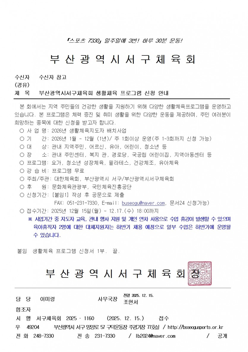 붙임 생활체육 프로그램 신청서 1부. 끝.